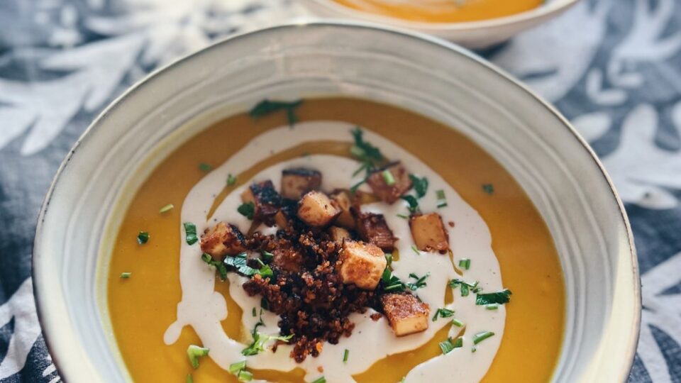 Juha od bundeve s kremom od bijelog graha & spicy prženim kockicama tofua